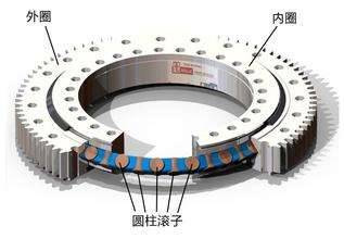 转盘轴承(又称回转支承)是大型机械设备中的关键部件,能够承受综合载荷,可同时承受较大的轴向、径向负荷和倾覆力矩。下图为转盘轴承典型结构,包含外圈、内圈及圆柱滚子。