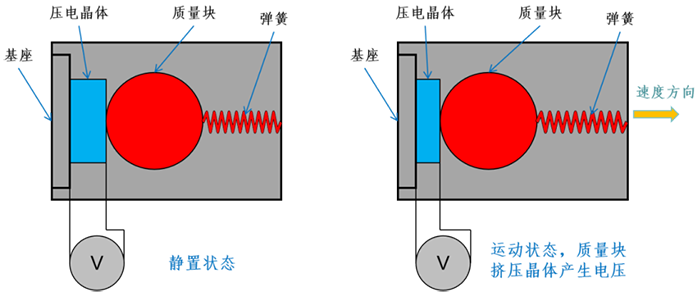 压电式加速度传感器一般由壳体、装在壳体内的弹簧、质量块、压电晶体和固定安装的基座组成。在压电晶体上放置一个质量块,然后用硬弹簧对质量块预加载荷,再将整个组件装在一个基座的金属壳体内。