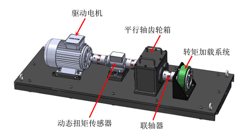 本实验系统由伺服电机、转子系统、传感器安装支架、联轴器、平行轴齿轮箱、转矩加载系统、平台底板、试验台控制系统等组成。整体设备尺寸为1000mm×350mm×365mm。