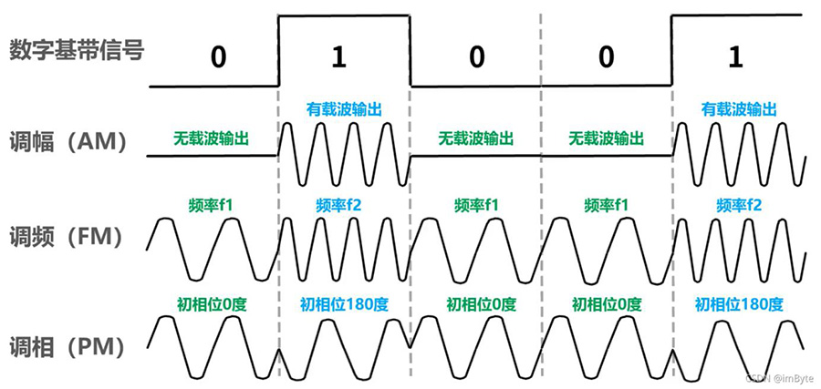 调制是指将要传输的信息信号(基带信号/控制信号/调制信号)按照一定的规则改变载波信号的某个或某些参数(如幅度、频率、相位)的过程。
