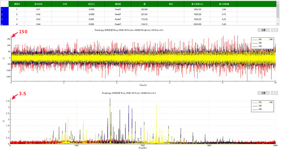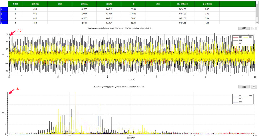 均有峰值出现:两种故障的频域图中,各通道(像 CH1、CH2、CH3、CH4 )在特定频率点都会出现峰值,意味着故障会引发特定频率的振动能量集中,这些峰值和点蚀产生的冲击、振动激励相关。