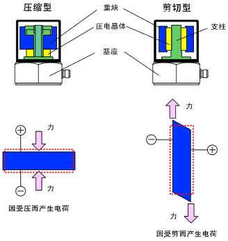 压电式加速度传感器一般由壳体、装在壳体内的弹簧、质量块、压电晶体和固定安装的基座组成。在压电晶体上放置一个质量块,然后用硬弹簧对质量块预加载荷,再将整个组件装在一个基座的金属壳体内。