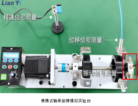 如下图所示,在便携式轴承故障模拟实验台安装振动加速度传感器、电涡流传感器、转速传感器,进行滚动轴承故障模拟实验。