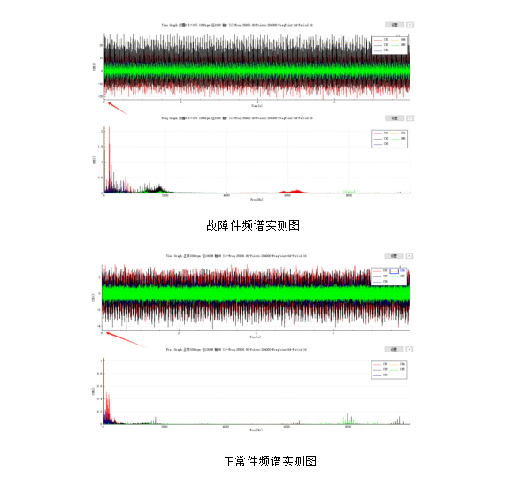 如下图所示,对比箭头处的幅值,下图的幅值明显更大。当轴承自身旋转经过故障点位(滚道或滚珠上的故障点)时,每次都会产生冲击信号。通过数据采集软件可以直观的了解到正常轴承与故障轴承的振动波形及频谱特征,可以对两组数据进行故障诊断分析。