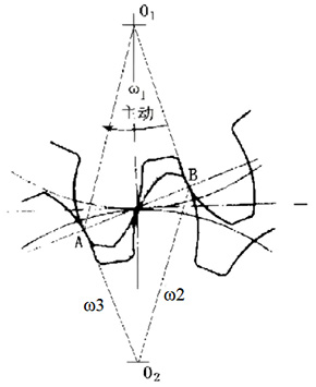 假定主动轮以ω1作匀角速度运动,A、B分别为两个啮合点,则有O1A>O1B,即A点的线速度VA大于B点的线速度VB。而O2A<O2B,从理论上有ω2=VB/O2B、ω3=VA/O2A,则ω2<ω3。