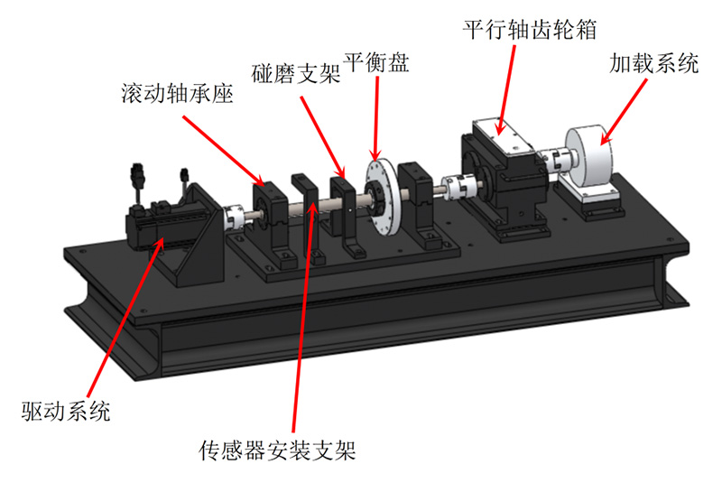 本实验系统由伺服电机、转子系统、传感器安装支架、联轴器、平行轴齿轮箱、转矩加载系统、平台底板、试验台控制系统等组成。整体设备尺寸为1000mm×350mm×365mm。